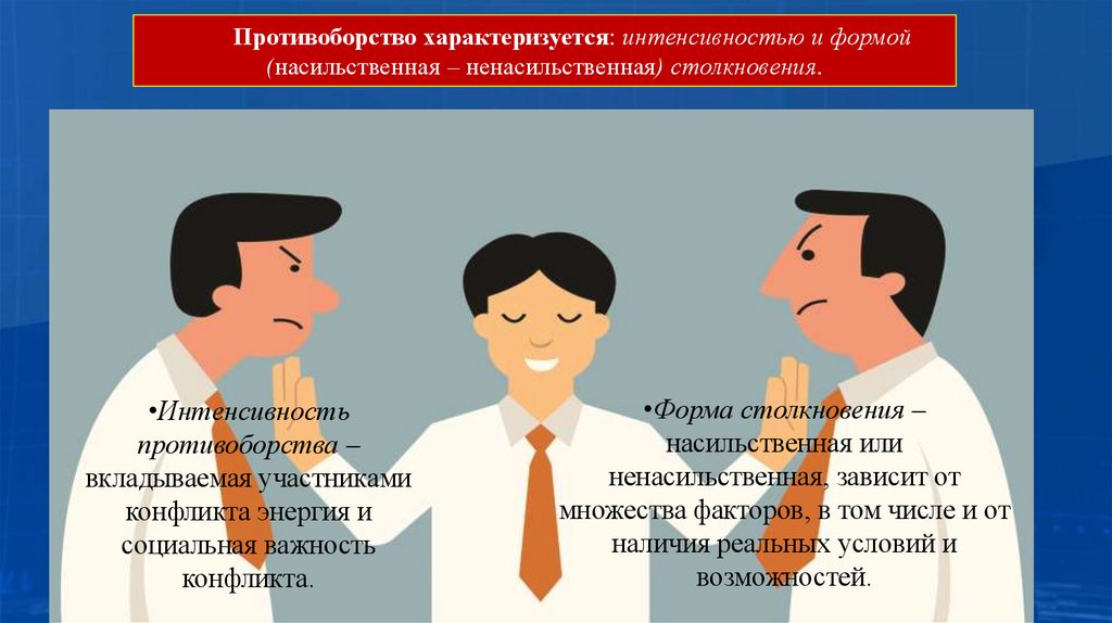 Противоборство характеризуется: интенсивностью и формой(насильственная – ненасильственная) столкновения.