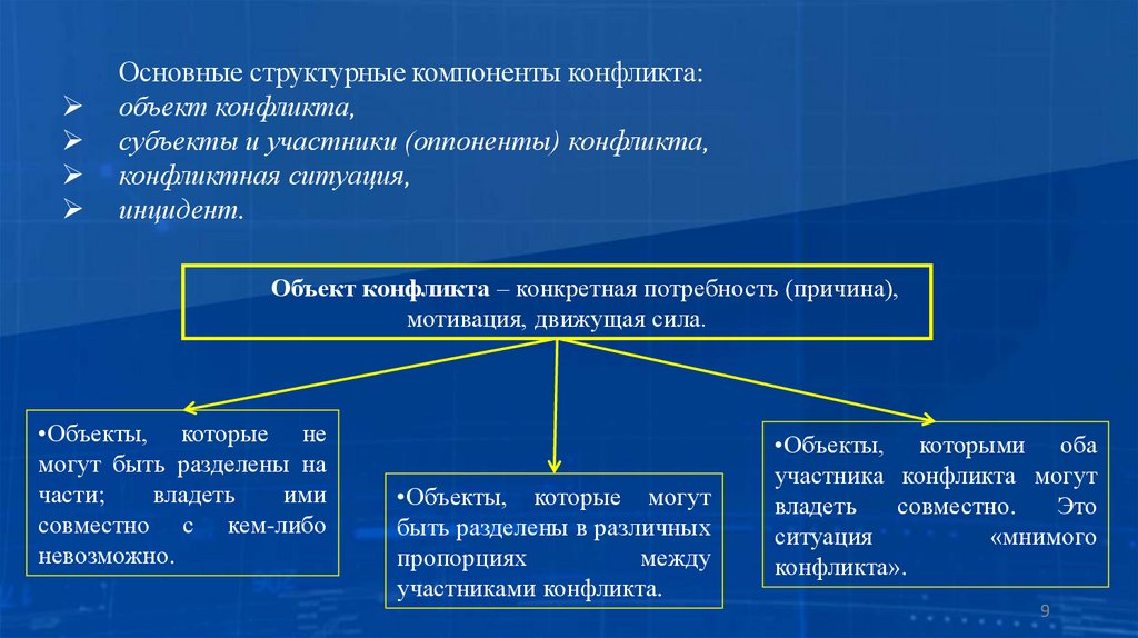 Основные структурные компоненты конфликта:объект конфликта,
