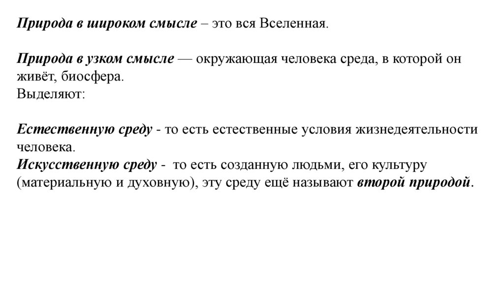 Природа в широком смысле – это вся Вселенная.Природа в узком смысле — окружающая человека среда, в которой он