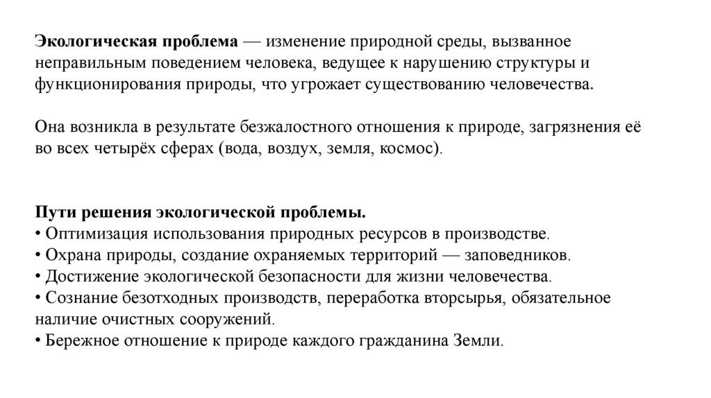 Экологическая проблема — изменение природной среды, вызванноенеправильным поведением человека, ведущее к нарушению структуры и