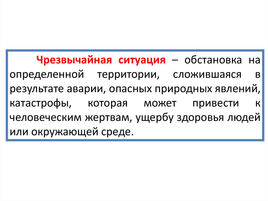 Чрезвычайная ситуация – обстановка наопределенной территории, сложившаяся в