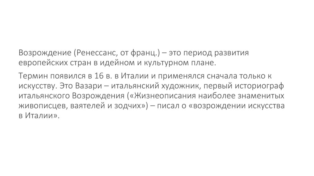 Возрождение (Ренессанс, от франц.) – это период развитияевропейских стран в идейном и культурном плане.