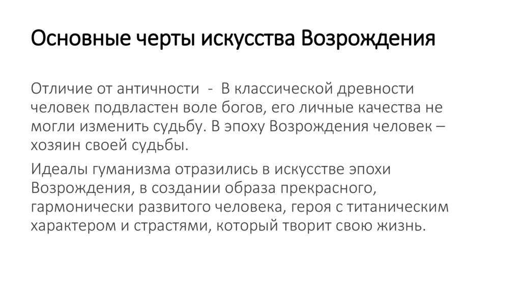 Основные черты искусства ВозрожденияОтличие от античности - В классической древности
