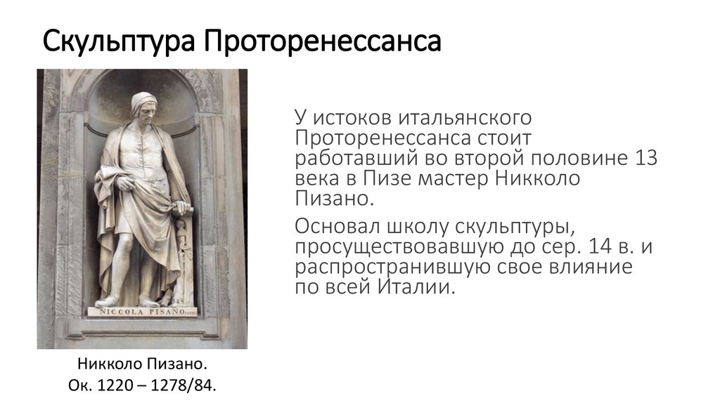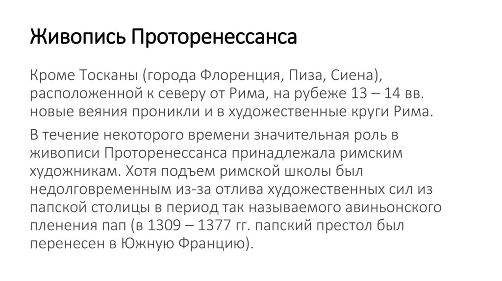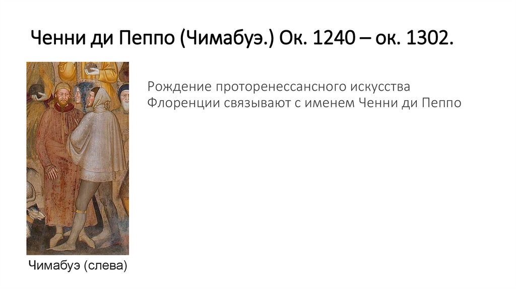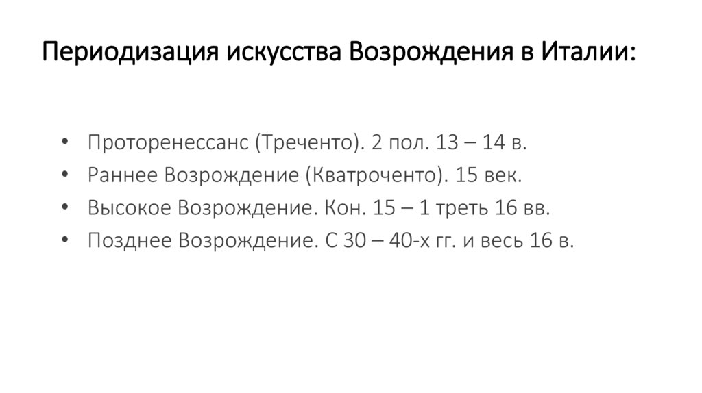 Периодизация искусства Возрождения в Италии:Проторенессанс (Треченто). 2 пол. 13 – 14 в.