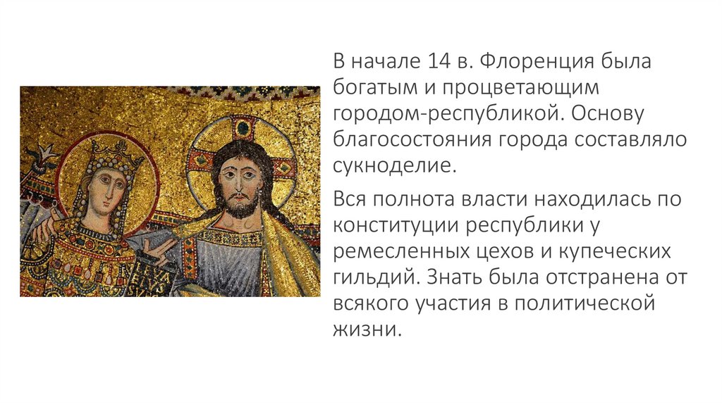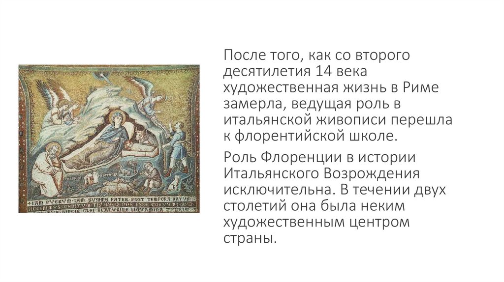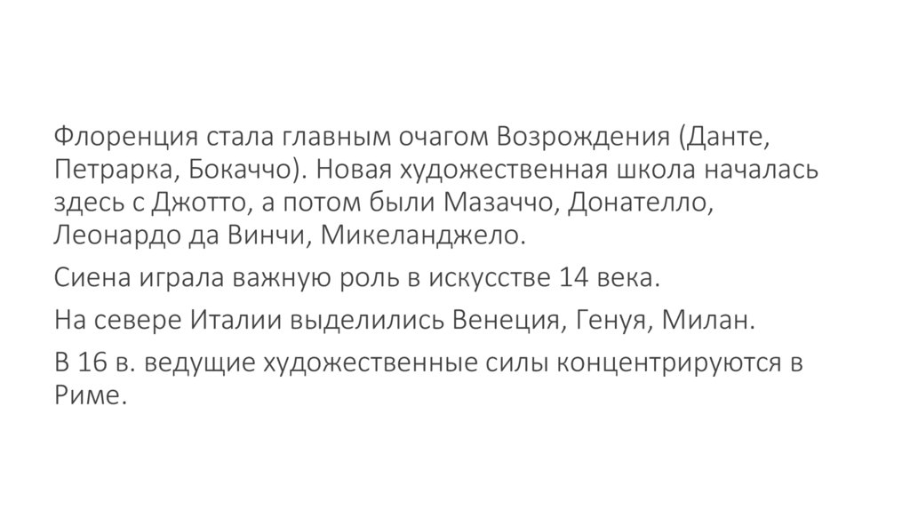 Флоренция стала главным очагом Возрождения (Данте,Петрарка, Бокаччо). Новая художественная школа началась