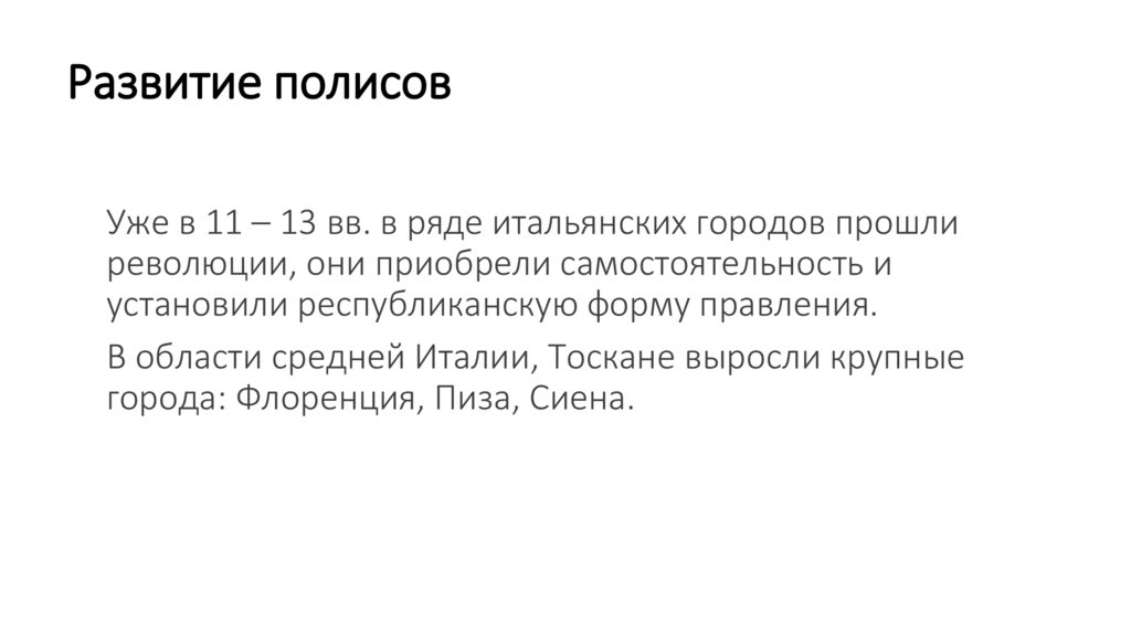 Развитие полисовУже в 11 – 13 вв. в ряде итальянских городов прошли