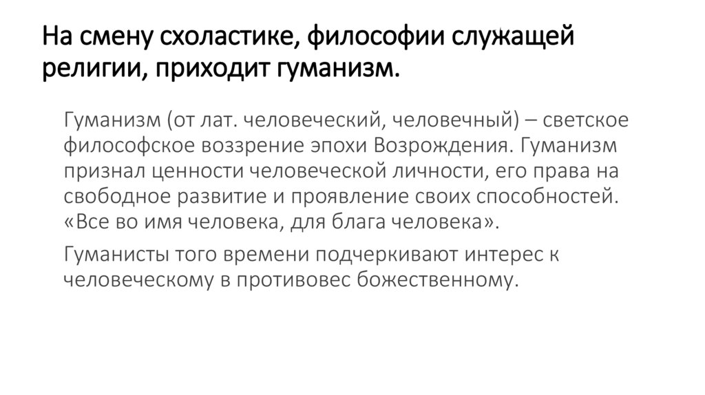 На смену схоластике, философии служащейрелигии, приходит гуманизм.