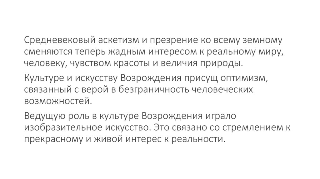 Средневековый аскетизм и презрение ко всему земномусменяются теперь жадным интересом к реальному миру,