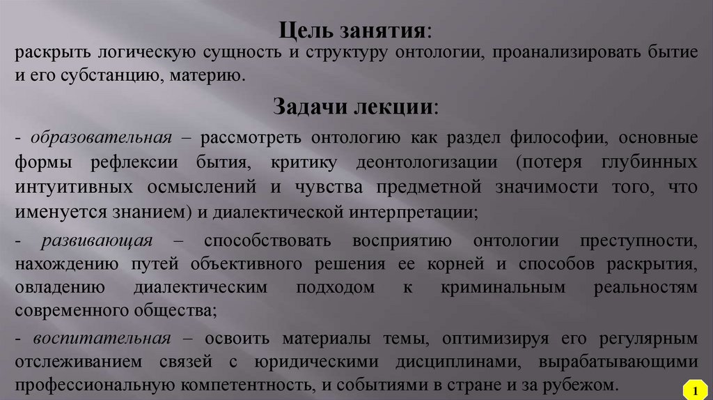 - образовательная – рассмотреть онтологию как раздел философии, основные