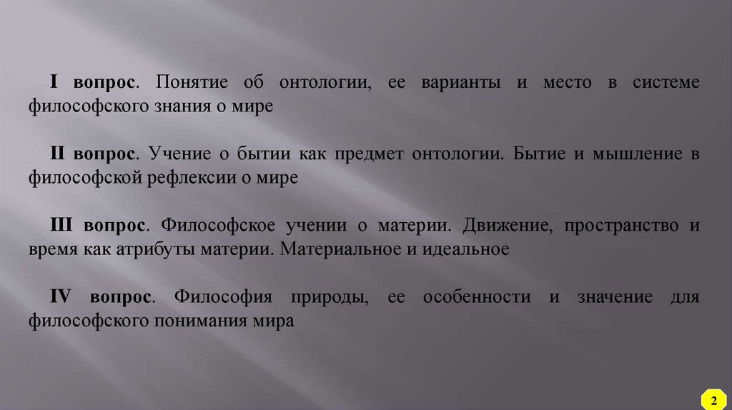I вопрос. Понятие об онтологии, ее варианты и место всистеме философского знания о мире