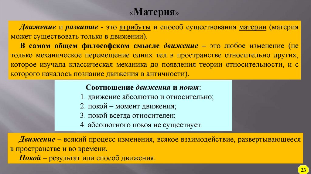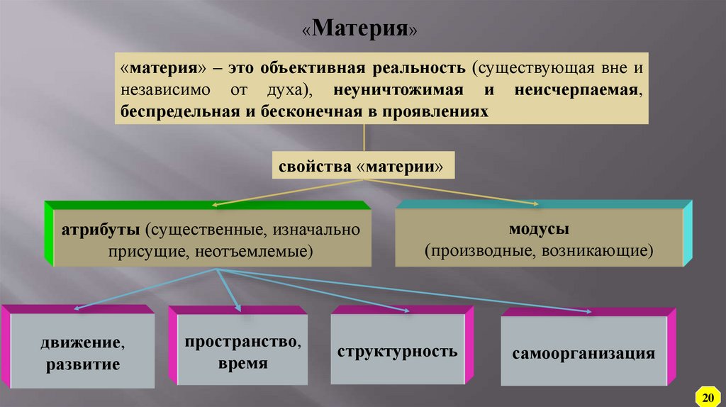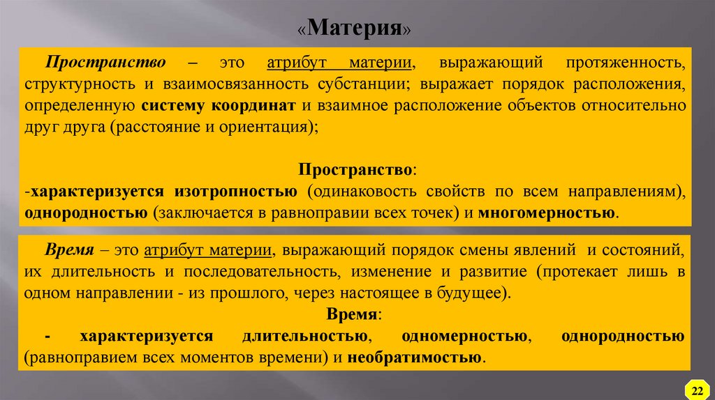 субстанциальность, многомерность, движение, развитие, жизнь, сознание.