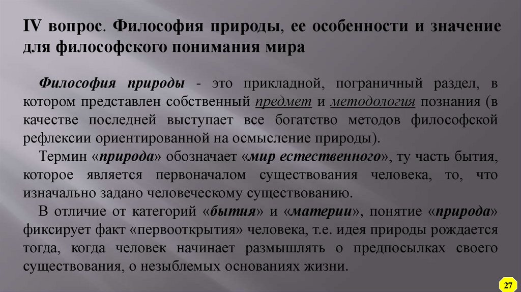 IV вопрос. Философия природы, ее особенности и значениедля философского понимания мира