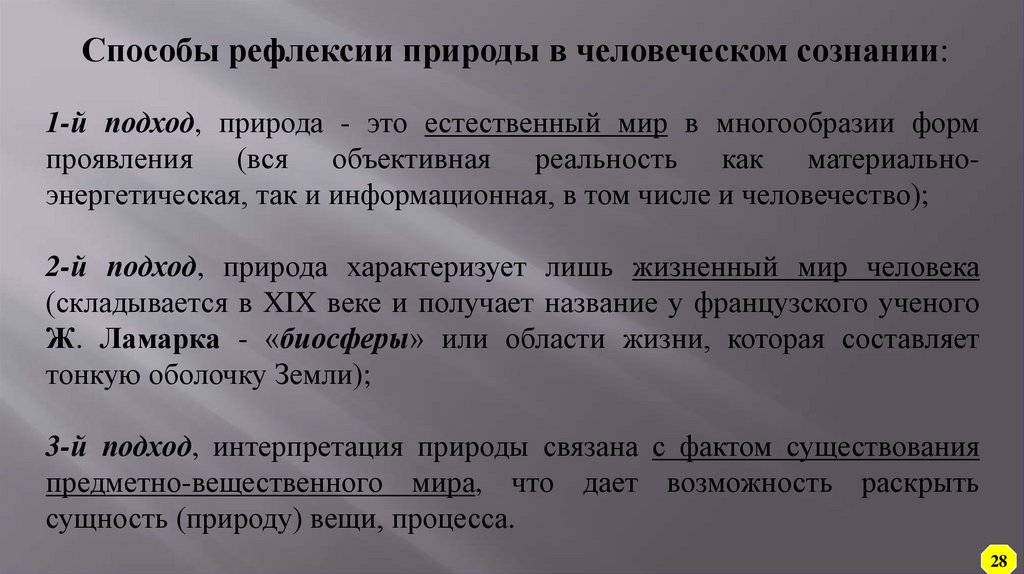 Способы рефлексии природы в человеческом сознании:1-й подход, природа - это естественный мир в многообразии форм