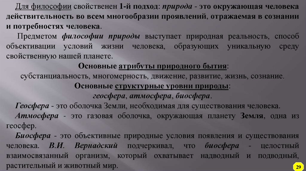 Для философии свойственен 1-й подход: природа - это окружающая человекадействительность во всем многообразии проявлений, отражаемая в сознании