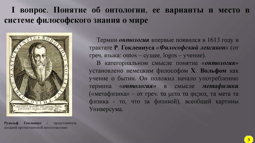 I вопрос. Понятие об онтологии, ее варианты и место в системефилософского знания о мире