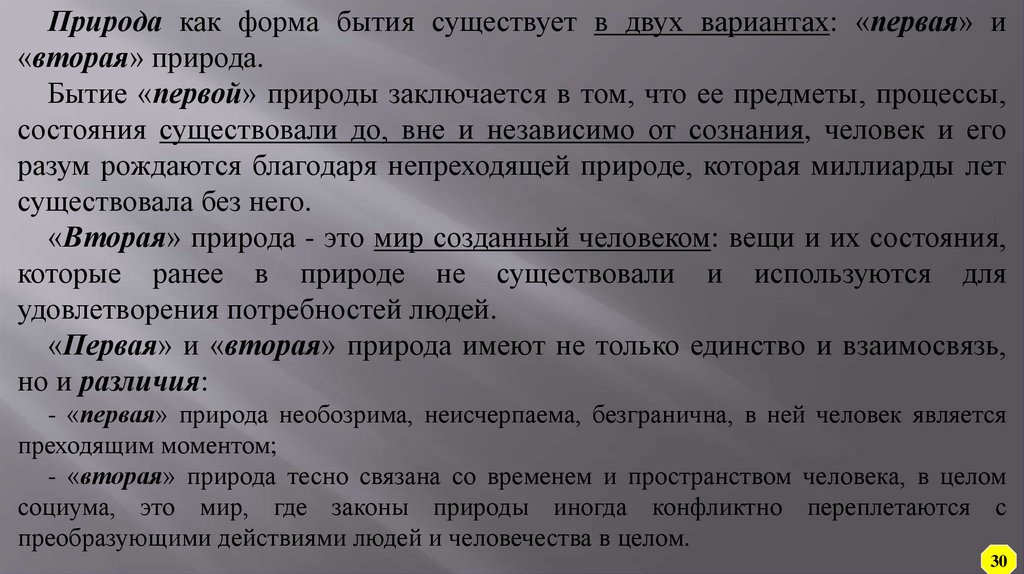 Природа как форма бытия существует в двух вариантах: «первая» и«вторая» природа.