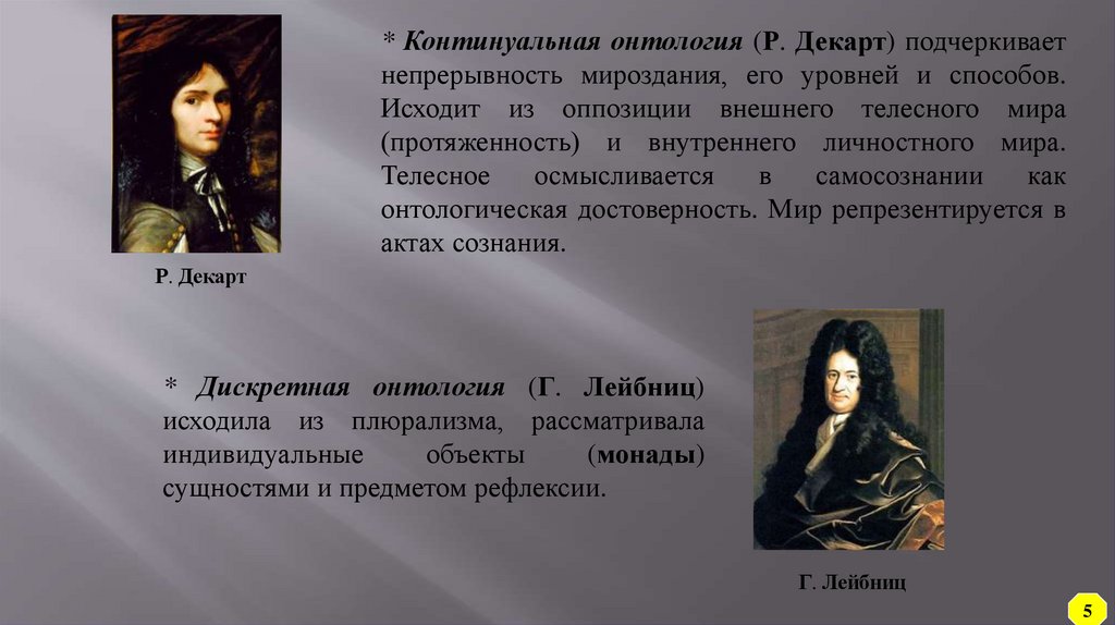 * Континуальная онтология (Р. Декарт) подчеркиваетнепрерывность мироздания, его уровней и способов.