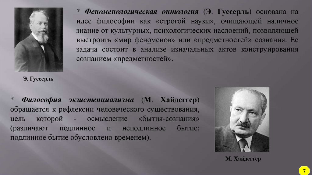 * Феноменологическая онтология (Э. Гуссерль) основана наидее философии как «строгой науки», очищающей наличное