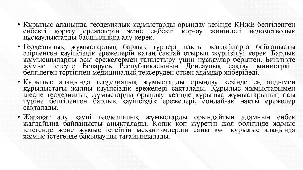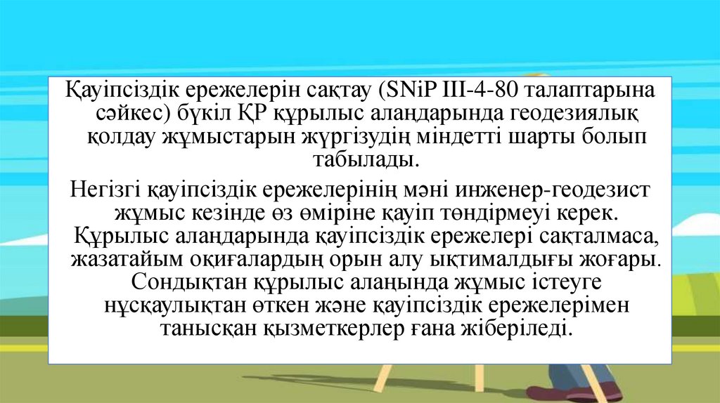 Қауіпсіздік ережелерін сақтау (SNiP III-4-80 талаптарынасәйкес) бүкіл ҚР құрылыс алаңдарында геодезиялық