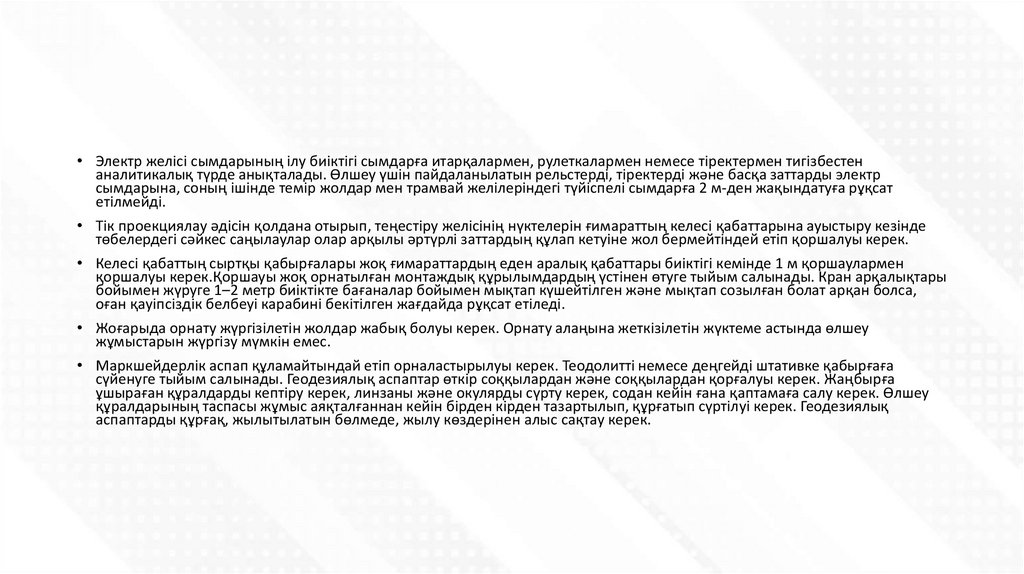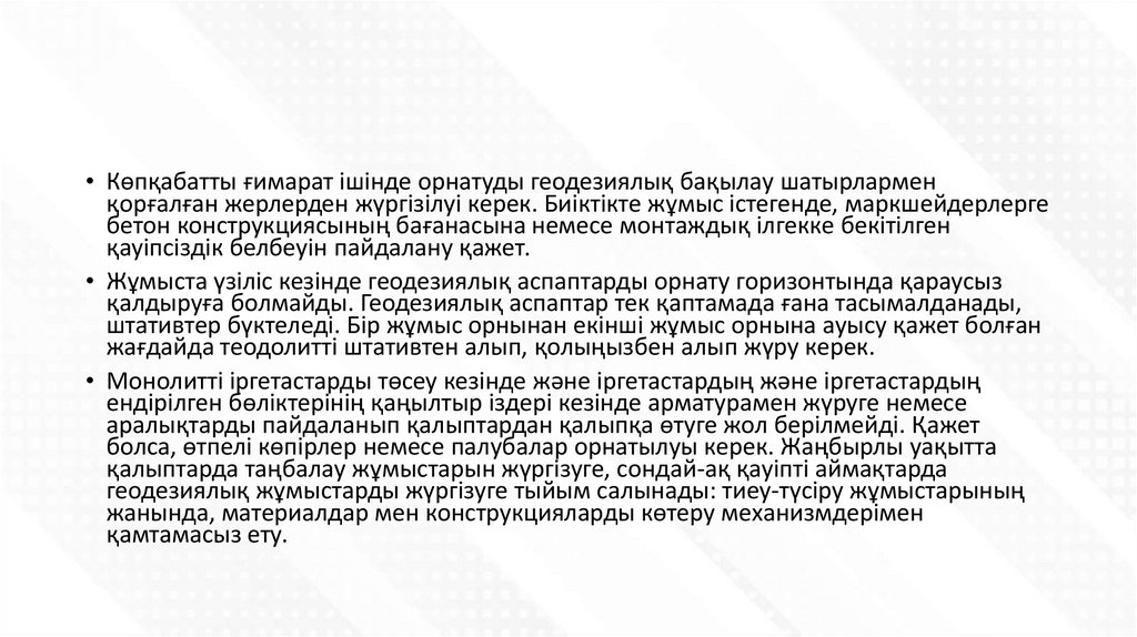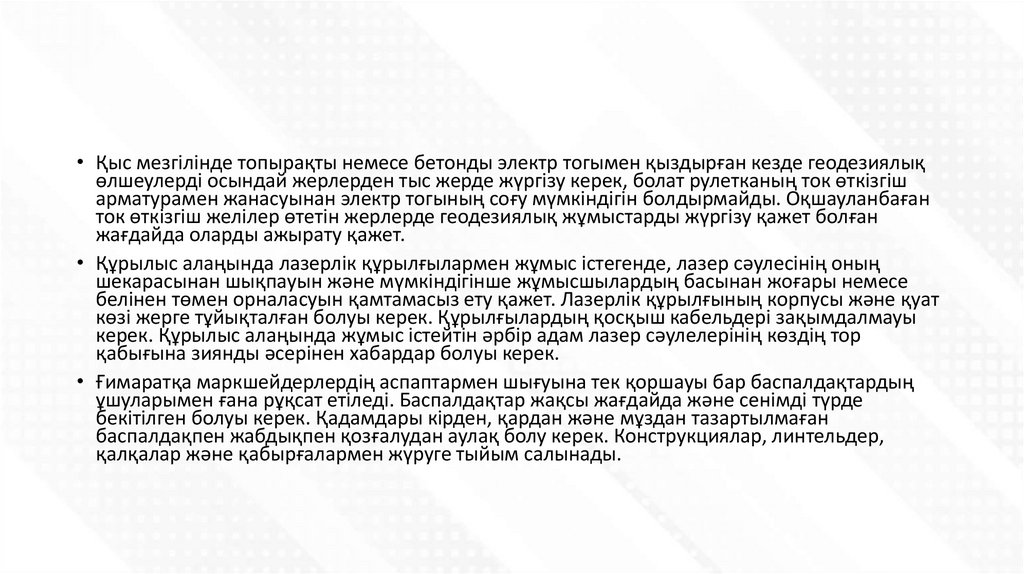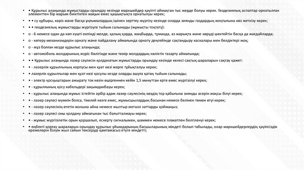 • Құрылыс алаңында жұмыстарды орындау кезінде маркшейдер қауіпті аймақтан тыс жерде болуы керек. Геодезиялық аспаптар орнатылған