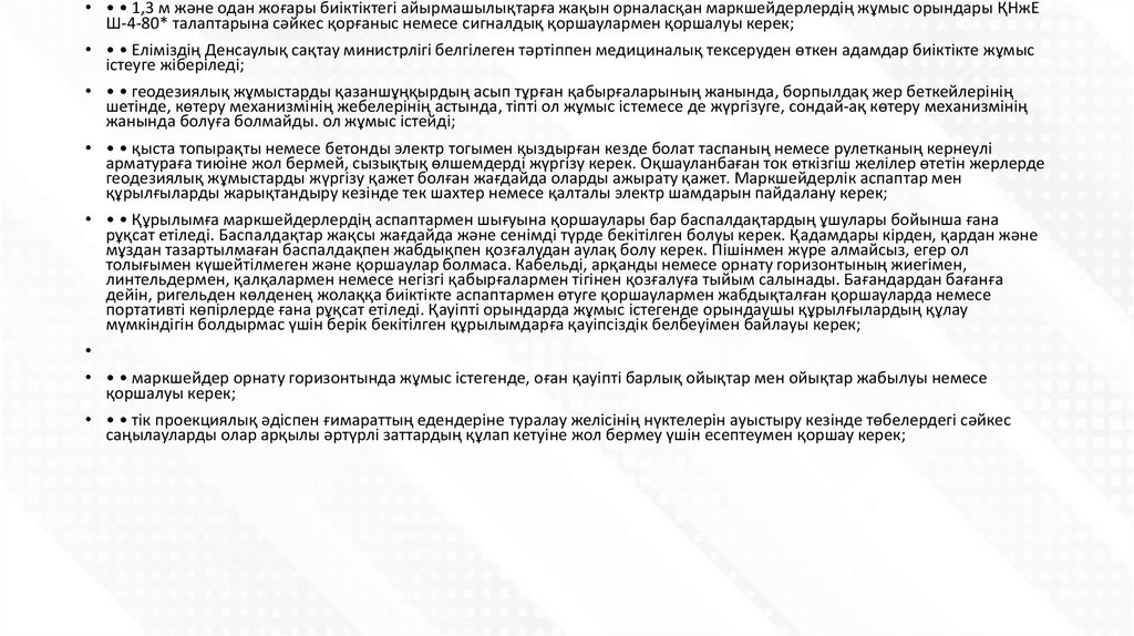• • • 1,3 м және одан жоғары биіктіктегі айырмашылықтарға жақын орналасқан маркшейдерлердің жұмыс орындары ҚНжЕШ-4-80* талаптарына сәйкес қорғаныс немесе сигналдық қоршаулармен қоршалуы керек;