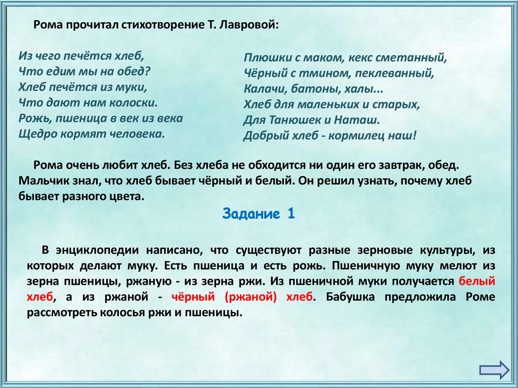 Рома прочитал стихотворение Т. Лавровой:Из чего печётся хлеб,