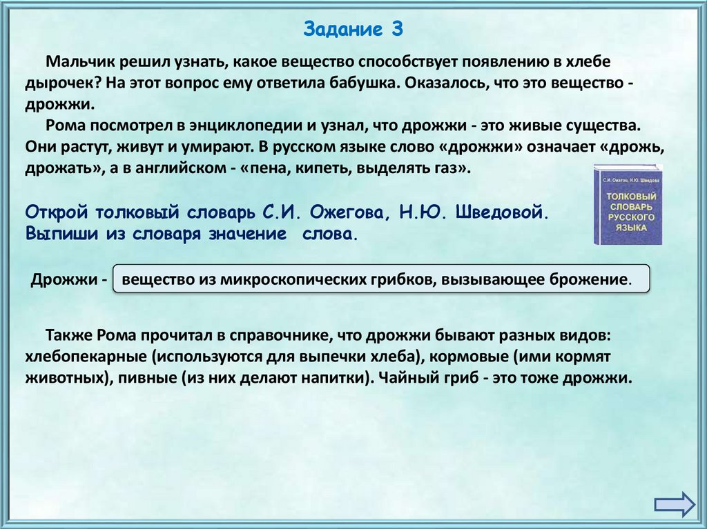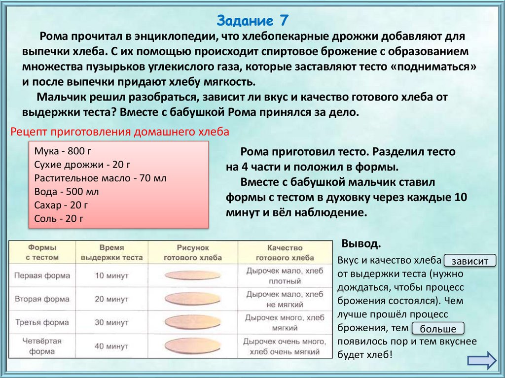 Задание 7Рома прочитал в энциклопедии, что хлебопекарные дрожжи добавляют для