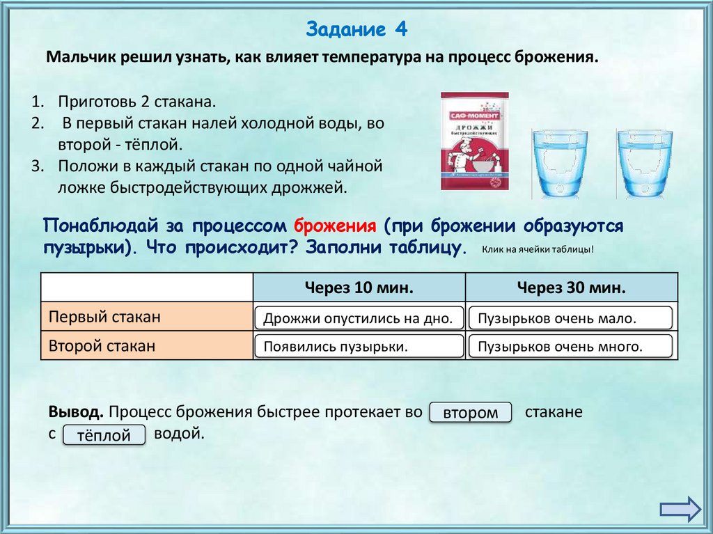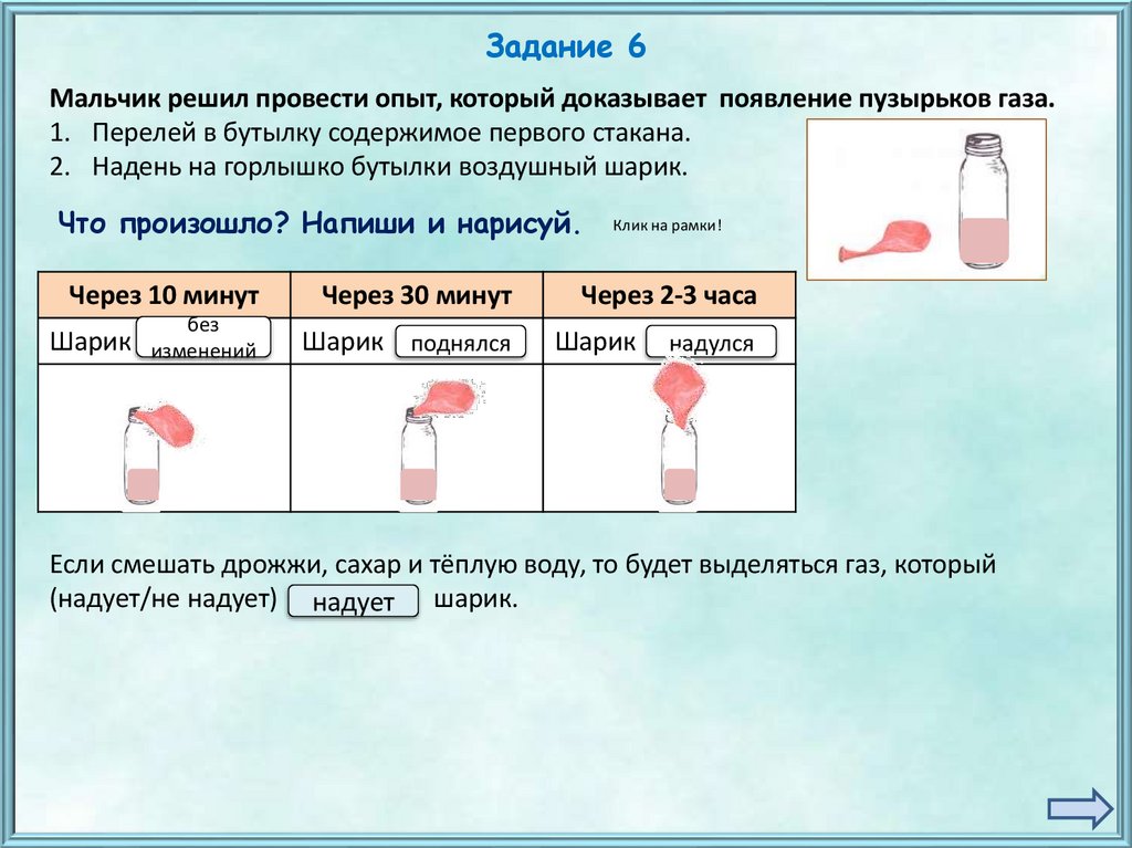 пузырьки). Что происходит? Заполни таблицу. Клик на ячейки таблицы!