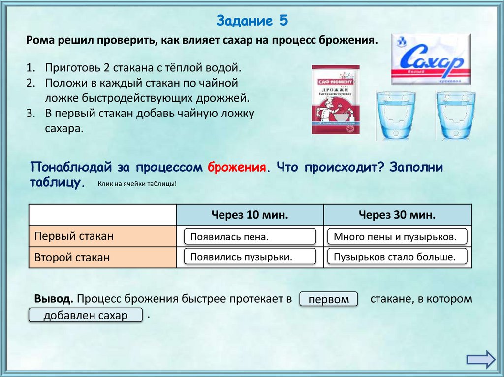 Задание 5Рома решил проверить, как влияет сахар на процесс брожения.