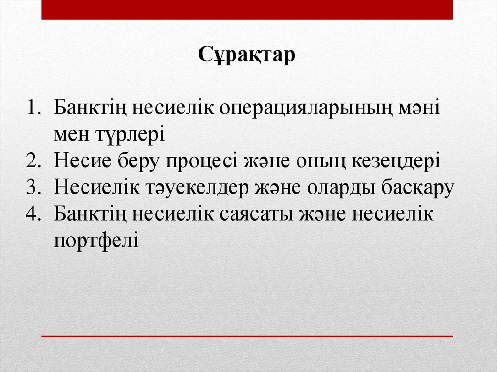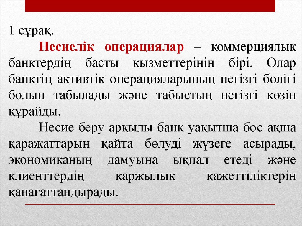 Сұрақтар1. Банктің несиелік операцияларының мәні