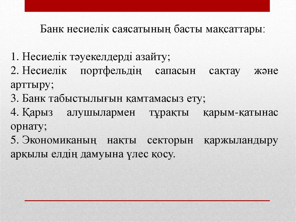 Банк несиелік саясатының басты мақсаттары:1. Несиелік тәуекелдерді азайту;