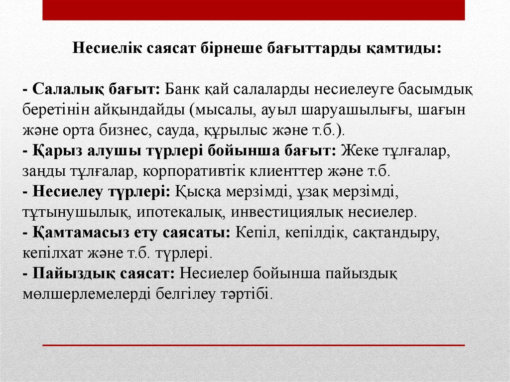 Несиелік саясат бірнеше бағыттарды қамтиды:- Салалық бағыт: Банк қай салаларды несиелеуге басымдық