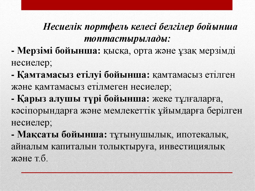 Несиелік портфель келесі белгілер бойыншатоптастырылады: