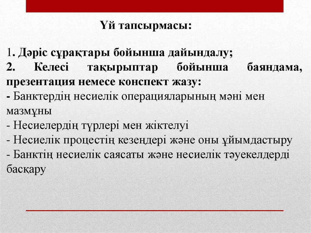 Үй тапсырмасы:1. Дәріс сұрақтары бойынша дайындалу;
