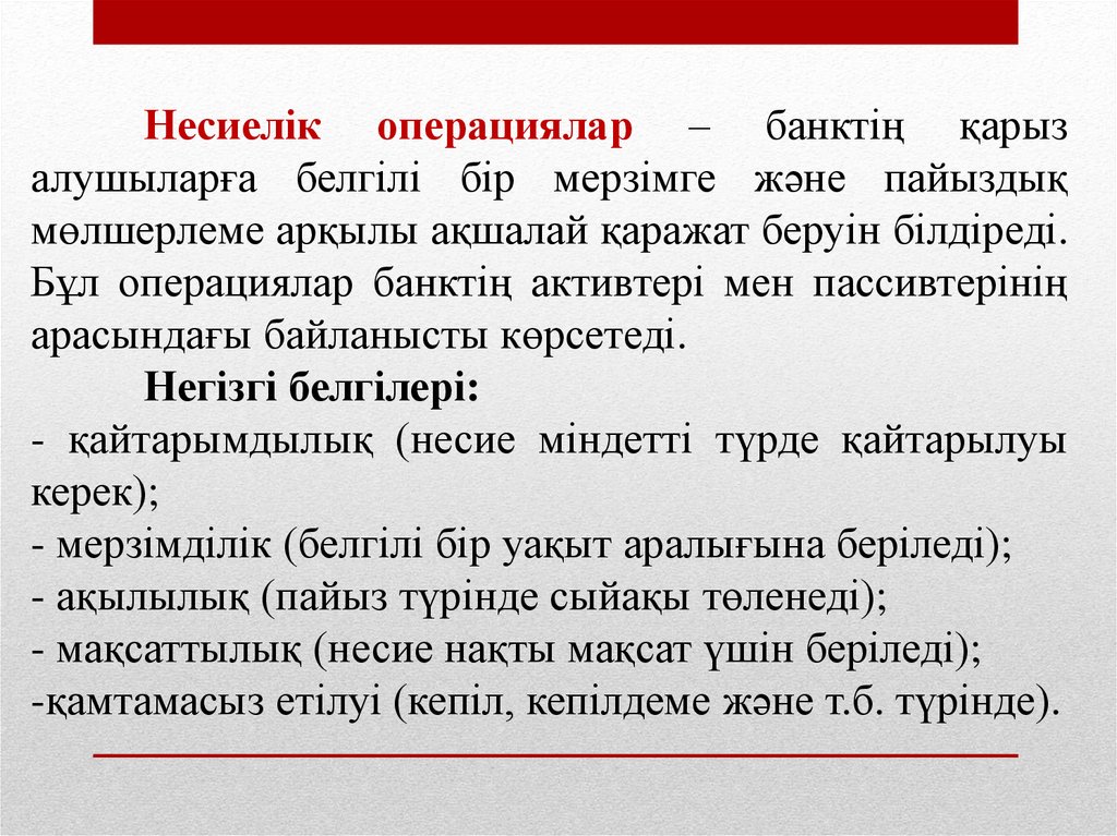 Несиелік операциялар – банктің қарызалушыларға белгілі бір мерзімге және пайыздық