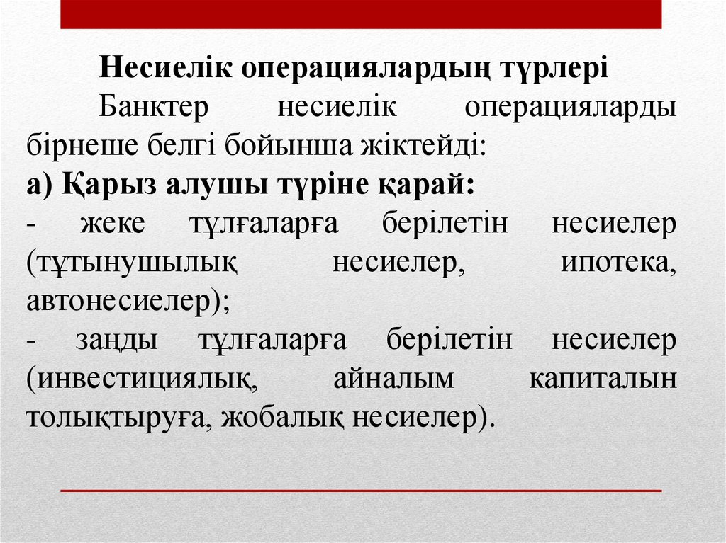 тұтынушылық, ипотекалық, инвестициялық несиелер.
