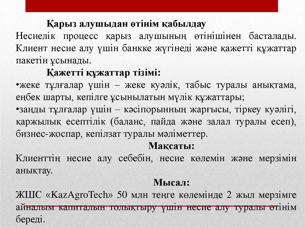 Қарыз алушыдан өтінім қабылдауНесиелік процесс қарыз алушының өтінішінен басталады.