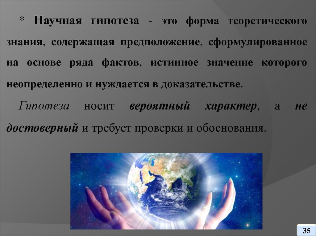 * Научная гипотеза - это форма теоретическогознания, содержащая предположение, сформулированное