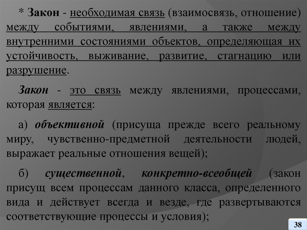 * Закон - необходимая связь (взаимосвязь, отношение)между событиями, явлениями, а также между