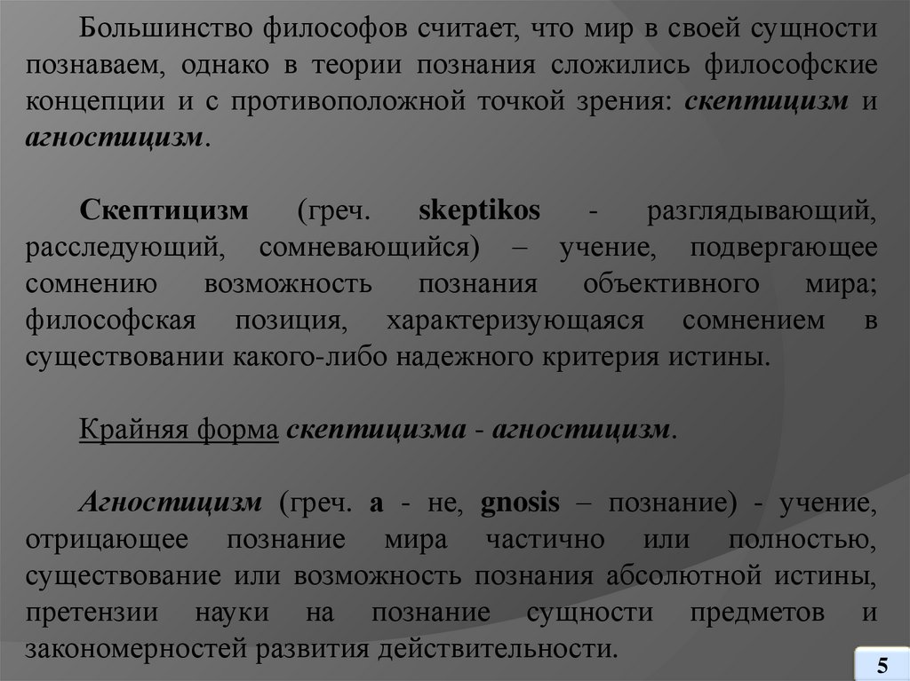Большинство философов считает, что мир в своей сущностипознаваем, однако в теории познания сложились философские