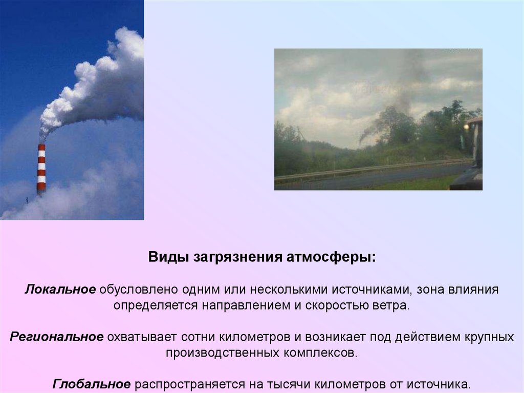 Виды загрязнения атмосферы:Локальное обусловлено одним или несколькими источниками, зона влияния