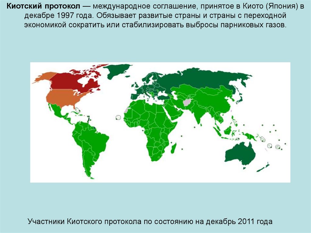 Киотский протокол — международное соглашение, принятое в Киото (Япония) вдекабре 1997 года. Обязывает развитые страны и страны с переходной