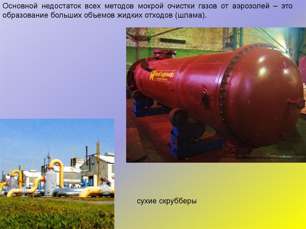 Основной недостаток всех методов мокрой очистки газов от аэрозолей – этообразование больших объемов жидких отходов (шлама).