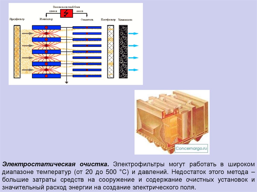 Электростатическая очистка. Электрофильтры могут работать в широкомдиапазоне температур (от 20 до 500 °С) и давлений. Недостаток этого метода –