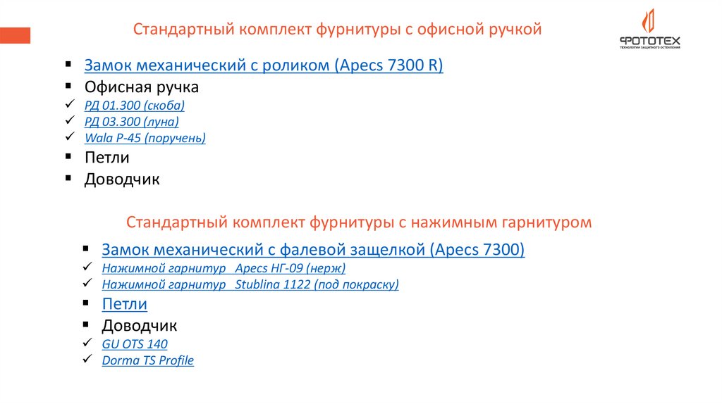 Стандартный комплект фурнитуры с офисной ручкойЗамок механический с роликом (Apecs 7300 R)