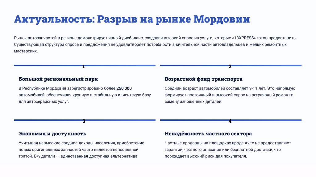 Актуальность: Разрыв на рынке МордовииРынок автозапчастей в регионе демонстрирует явный дисбаланс, создавая высокий спрос на услуги, которые «13XPRESS» готов предоставить.