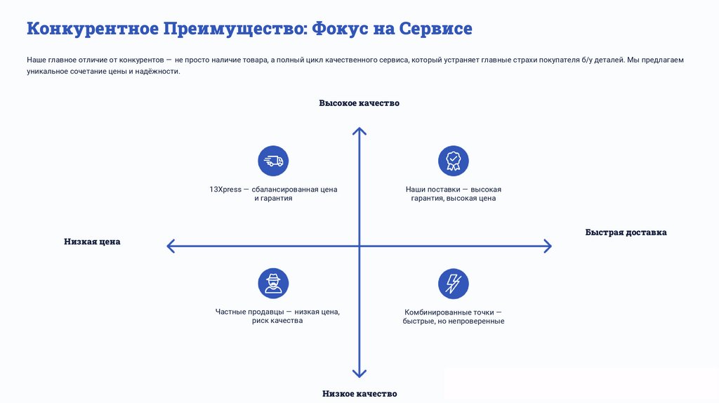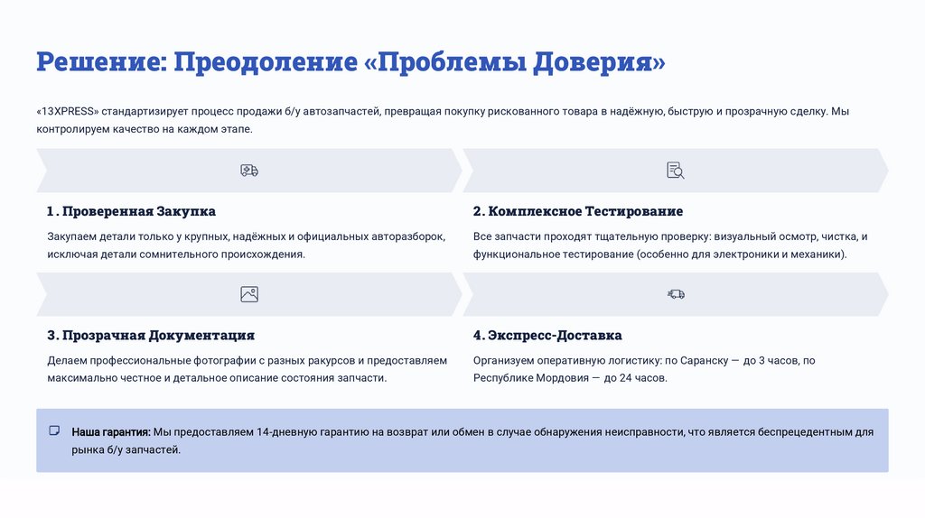 Решение: Преодоление «Проблемы Доверия»«13XPRESS» стандартизирует процесс продажи б/у автозапчастей, превращая покупку рискованного товара в надёжную, быструю и прозрачную сделку. Мы