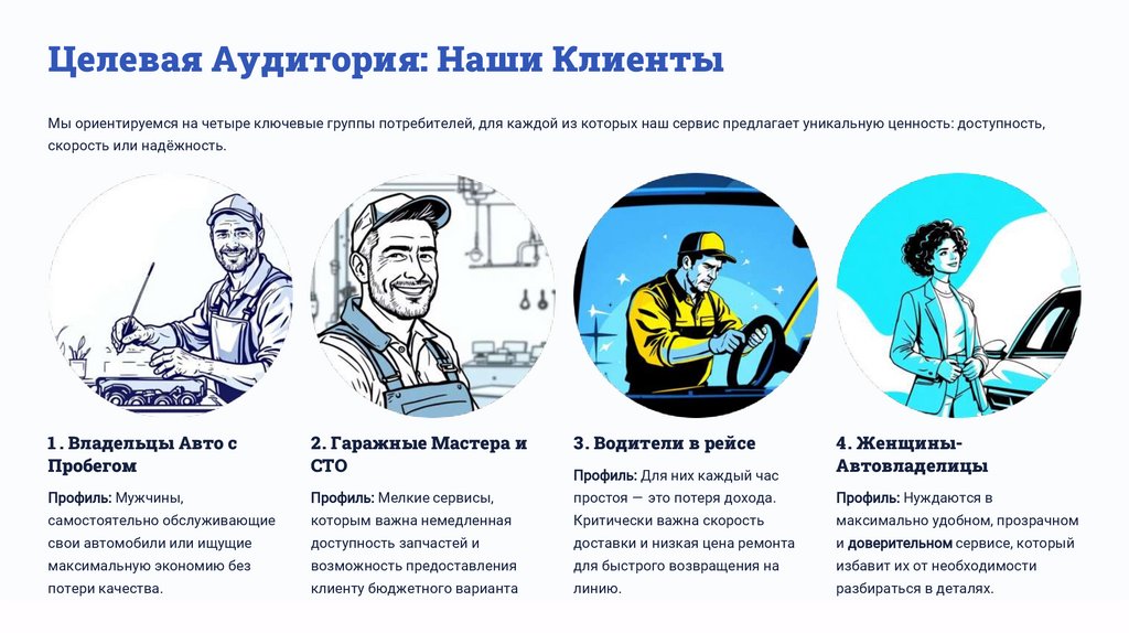 Целевая Аудитория: Наши КлиентыМы ориентируемся на четыре ключевые группы потребителей, для каждой из которых наш сервис предлагает уникальную ценность: доступность,