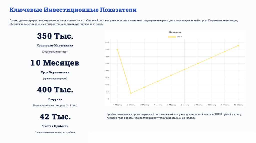 Ключевые Инвестиционные ПоказателиПроект демонстрирует высокую скорость окупаемости и стабильный рост выручки, опираясь на низкие операционные расходы и гарантированный спрос. Стартовые инвестиции,