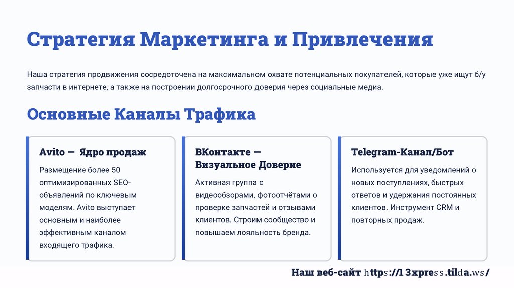 Стратегия Маркетинга и ПривлеченияНаша стратегия продвижения сосредоточена на максимальном охвате потенциальных покупателей, которые уже ищут б/у